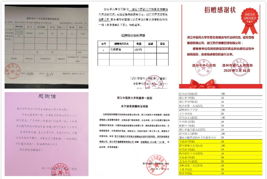 我校芳香生物精油与疗法研究院联合冠军香榧集团和浙江芳疗健康管理有限公司,针对本次疫情,以最快速度研制了从香榧、柠檬、广藿香等纯天然植物提取的防疫精油。该精油能一定程度上抗病毒、抗炎、提升免疫力、缓解紧张情绪、祛除体内湿气。病毒虽然很难被精油真正“杀”死,但精油会与病毒竞争人体细胞膜上的受体,或者直接附着在病毒表面,让它没有机会进入细胞去复制更多病毒,而拖延病毒的繁衍速度,为人体免疫系统争取更多时间去制造抗体、找出病毒并消灭它。自疫情发生以来,我校与上述企业协同合作,已向11个地市27家医疗机构及单位捐赠了2000瓶防疫精油,覆盖全省。