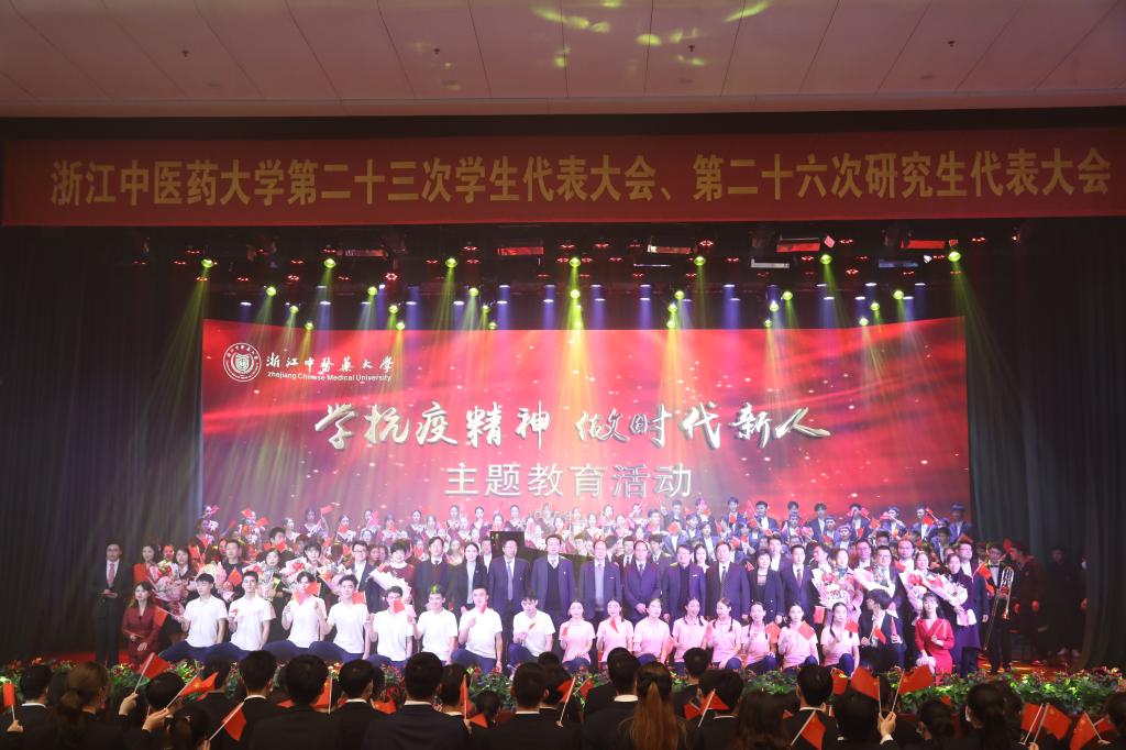 台上,16名学生代表18000余名浙中医大青年学子,向我校附属医院援鄂英雄献上鲜花和荣耀杯致敬。这不仅仅是一种致敬,一种荣耀,更是一种激励青年担当作为的时代传承。