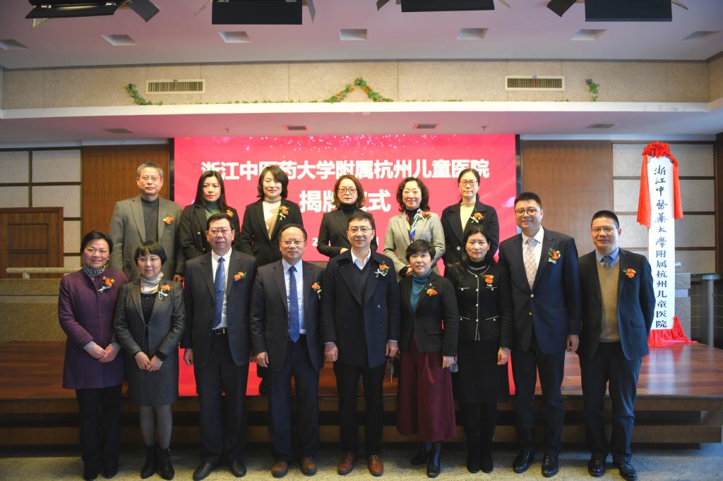 陈忠、吴承亮、应旭旻、詹强共同为“浙江中医药大学附属杭州儿童医院”揭牌。