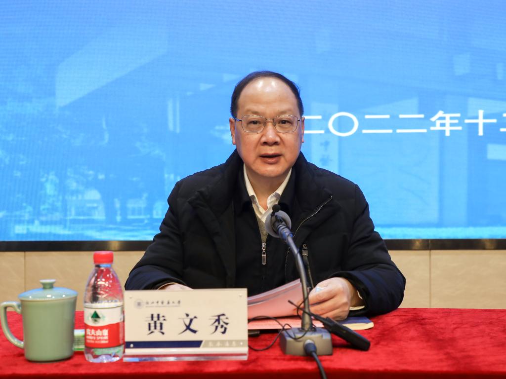 黄文秀在讲话中回顾了学校近段时间以来建设一流中医药大学的进展情况和工作成效,并充分肯定了各学院、部门(单位)近期工作所取得的成绩。黄文秀围绕学校下一阶段重点工作提出四点要求。一是深入学习贯彻党的二十大精神,加快推进一流中医药大学建设。要深刻领会党的二十大报告中关于教育、科技、人才、卫生、中医药等方面的重要论述和重大部署,按照省政府支持学校建设一流中医药大学工作专班第二次会议要求,聚焦富春主校区建设、一流学科和专业建设、创新平台建设、高端人才引育、浙中医系医院建设、服务共同富裕,全力加快推进一流中医药大学建设。二是坚持目标导向,切实做好年度工作总结和明年工作谋划。要对照今年的目标任务,认真分析总结经验;对照建设一流中医药大学的目标任务,科学确定2023年的工作计划。三是强化责任意识,切实做好当前校园安全稳定工作。要把做好当前校园安全稳定工作作为贯彻落实党的二十大精神的具体行动,作为当前一段时期内一项重要工作;不断提高网络媒体素养和舆情研判与应对能力,提前制定风险预案和相应制度,切实掌握舆论主动权;注意工作细节,强化人文关怀,主动帮助师生员工解决实际问题,努力为建设一流中医药大学营造良好环境。四是发挥中医药特色优势,彰显学校与附属医院的使命担当。当前正处于疫情扩散的特殊时期,要发挥中医药特色优势,主动承担社会责任,为全社会疫情防控提供良好的服务和帮助;进行精细策划,通过名医名方、视频推送、媒体宣传等途径,传播、普及中医药知识和防疫抗疫方法,扩大学校的美誉度和影响力。