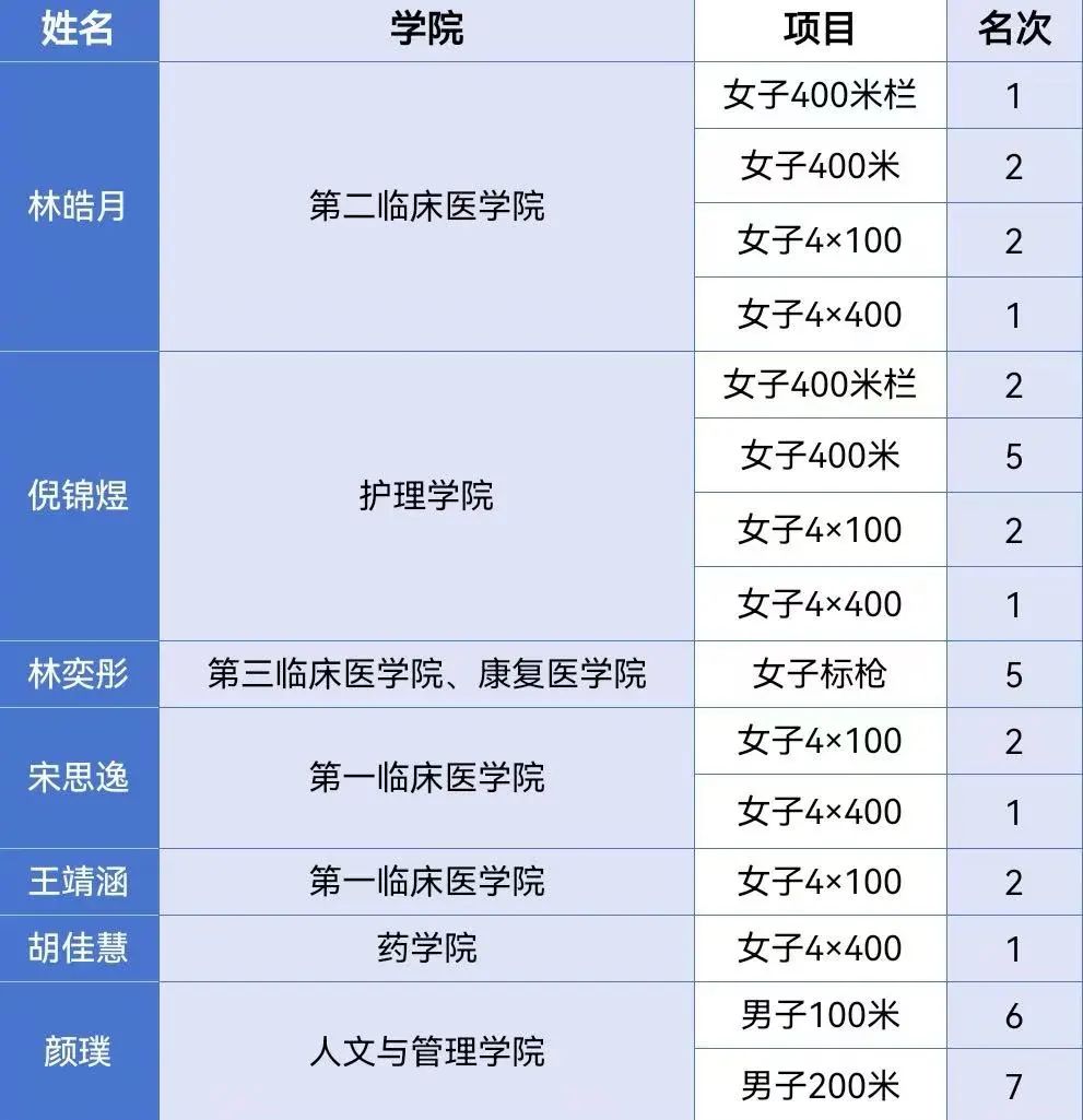 第二临床医学院林皓月获得女子400米栏比赛冠军和400米比赛亚军。护理学院倪锦煜获得女子400米栏比赛亚军和400米比赛第五名。人文与管理学院颜璞在男子100米和200米比赛中分获第六名和第七名。第三临床医学院林奕彤获得女子标枪比赛第五名。我校代表队还获女子4×400米接力赛冠军和女子4×100米接力赛亚军。林皓月、颜璞获评“优秀运动员”称号,方远、袁子航老师获评“优秀教练员”称号。