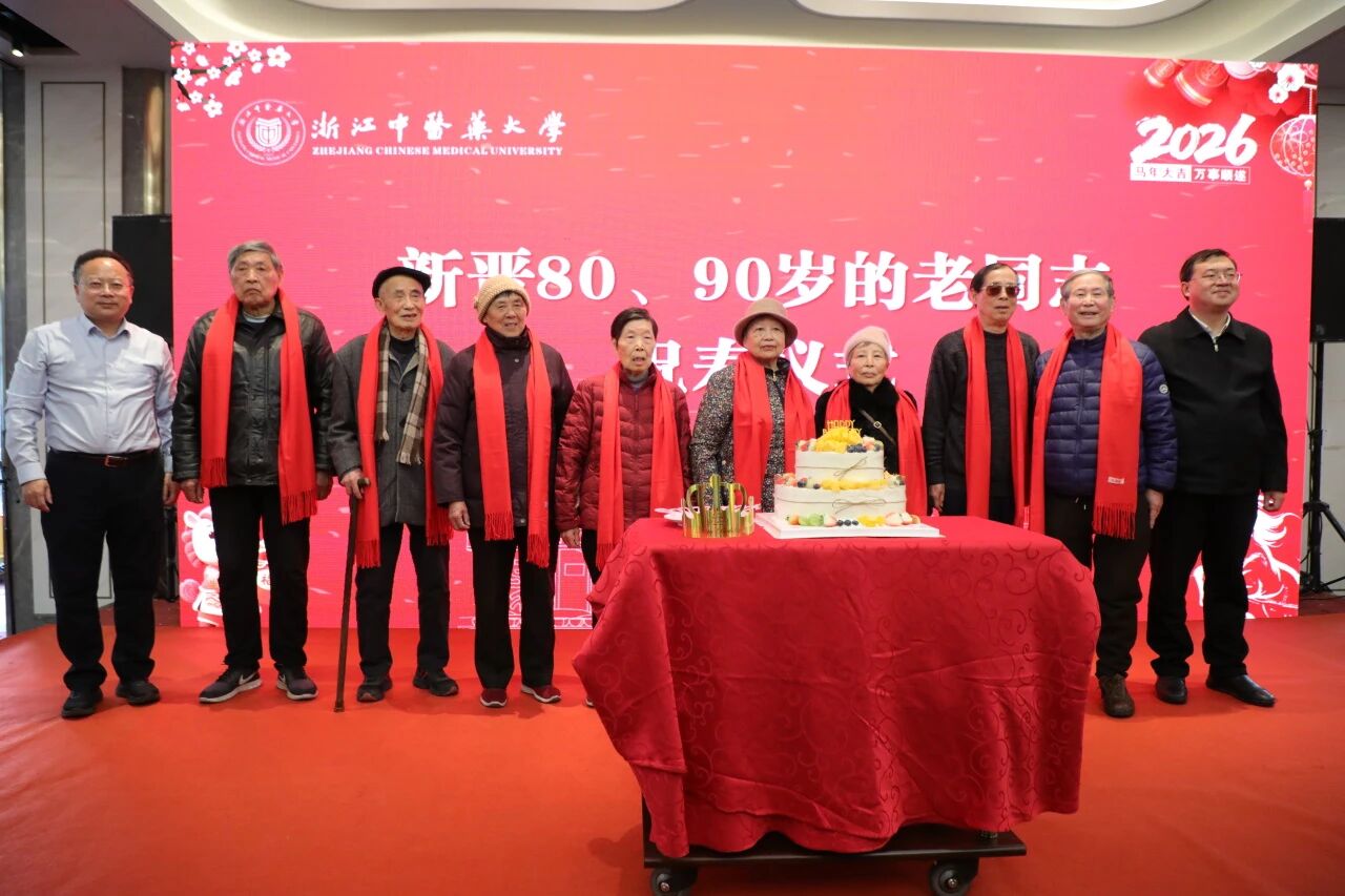 学校为新晋80岁和90岁的老同志举办祝寿仪式并送上红色长巾、长寿蛋糕和诚挚祝福。