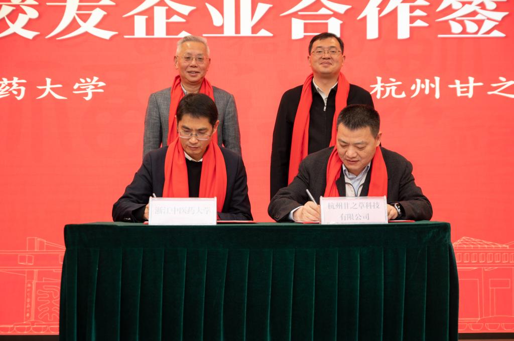 在王斌、方剑乔共同见证下,学校与校友企业杭州甘之草科技有限公司签署校企战略合作协议。