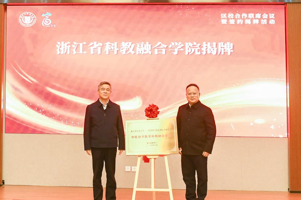 陈忠和吕华为浙江省科教融合学院——中医分子医学科教融合学院和浙江省大学科技园——浙江中医药大学科技园揭牌。